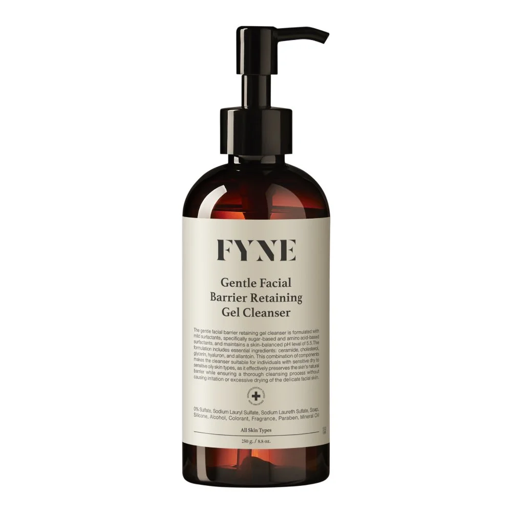 The gentle facial barrier retaining gel cleanser is formulated with mild surfactants, specifically sugar-based and amino acid-based surfactants, and maintains a skin-balanced pH level of 5.5. The formulation includes essential ingredients: ceramide, cholesterol, glycerin, hyaluron, and allantoin. This combination of components makes the cleanser suitable for individuals with sensitive dry to sensitive oily skin, as it effectively preserves the skin's natural barrier while ensuring a thorough cleansing process without causing irritation or excessive drying of the delicate facial skin.