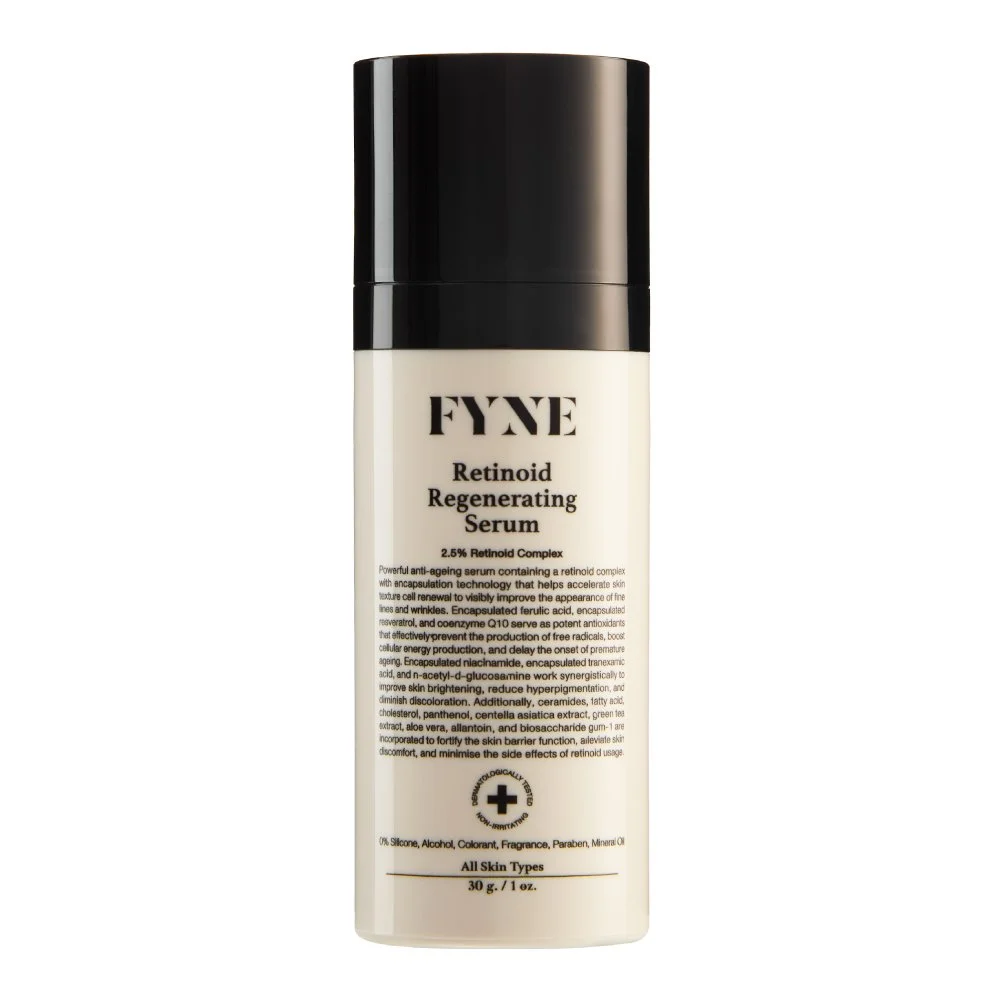 Powerful anti-ageing serum containing a retinoid complex with encapsulation technology that helps accelerate skin texture cell renewal to visibly improve the appearance of fine lines and wrinkles. Melatonin, encapsulated ferulic acid, encapsulated resveratrol, encapsulated coenzyme Q10 serveas potent antioxidants that effectively prevent the production of free radicals, boost cellular energyproduction, and delay the onset of premature ageing. Encapsulated niacinamide, encapsulated tranexamic acid, and n-acetyl-d-glucosamine work synergistically to improve skin brightening, reduce skin hyperpigmentation, and diminish discoloration. Additionally, ceramides, fatty acid, cholesterol, panthenol, centella asiatica extract, green tea extract, aloe vera extract, allantoin, and biosaccharide gum-1 are incorporated to fortify the skin barrier function, alleviate skin discomfort, and minimise the side effects of retinoid usage.